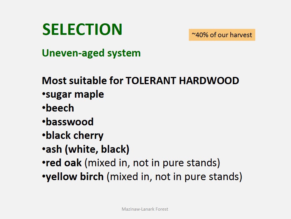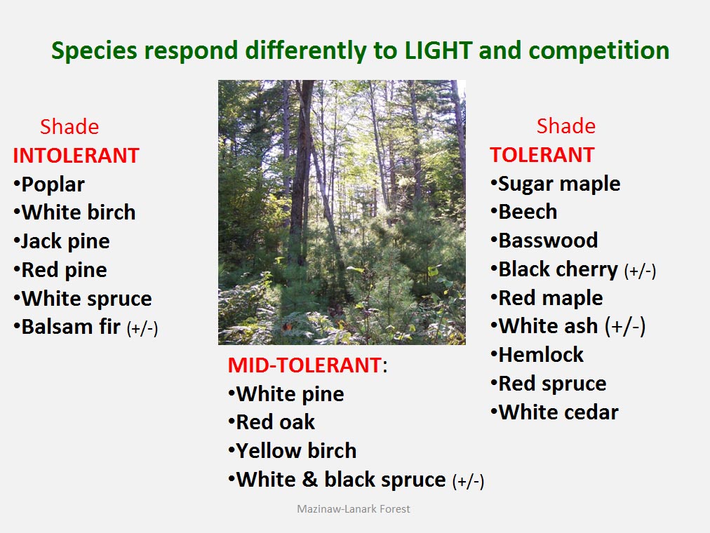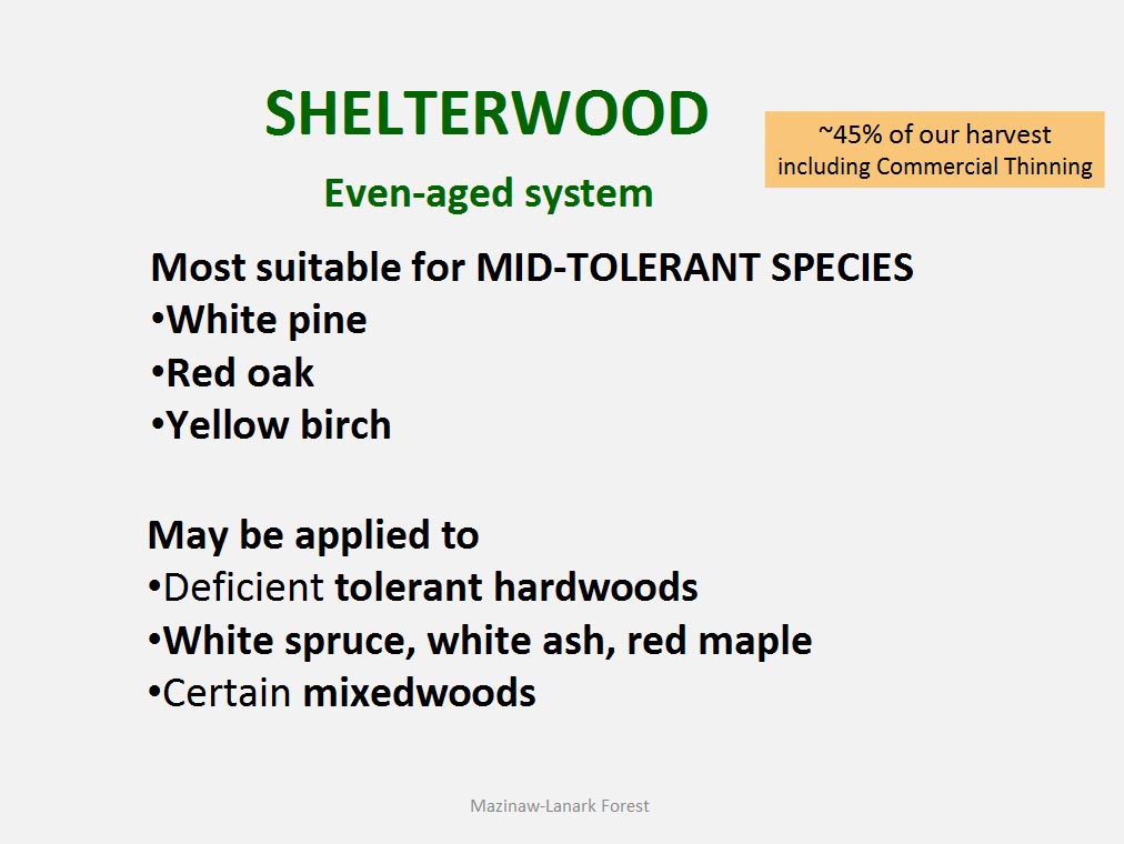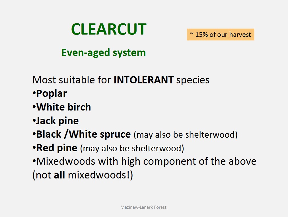 • Out of over 30 tree species known to occur in the Mazinaw-Lanark Forest 17 are encountered in the day-to-day forest operations.