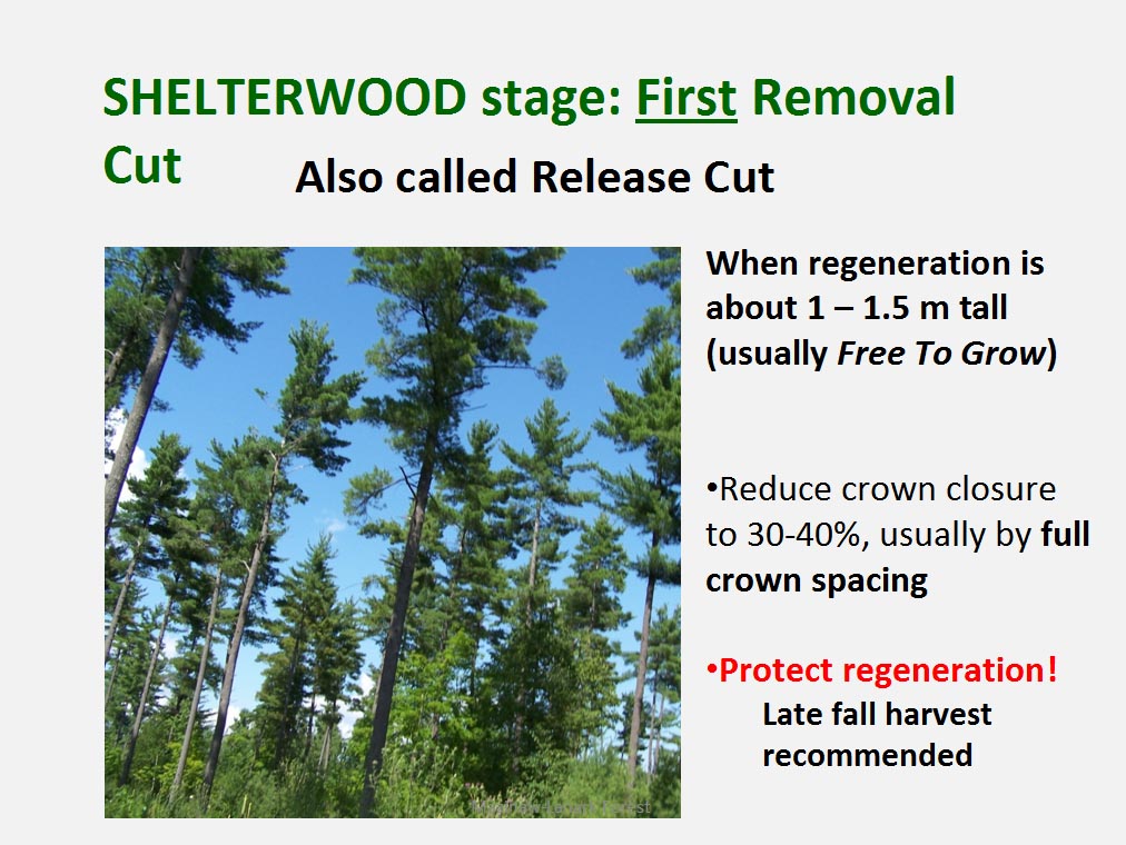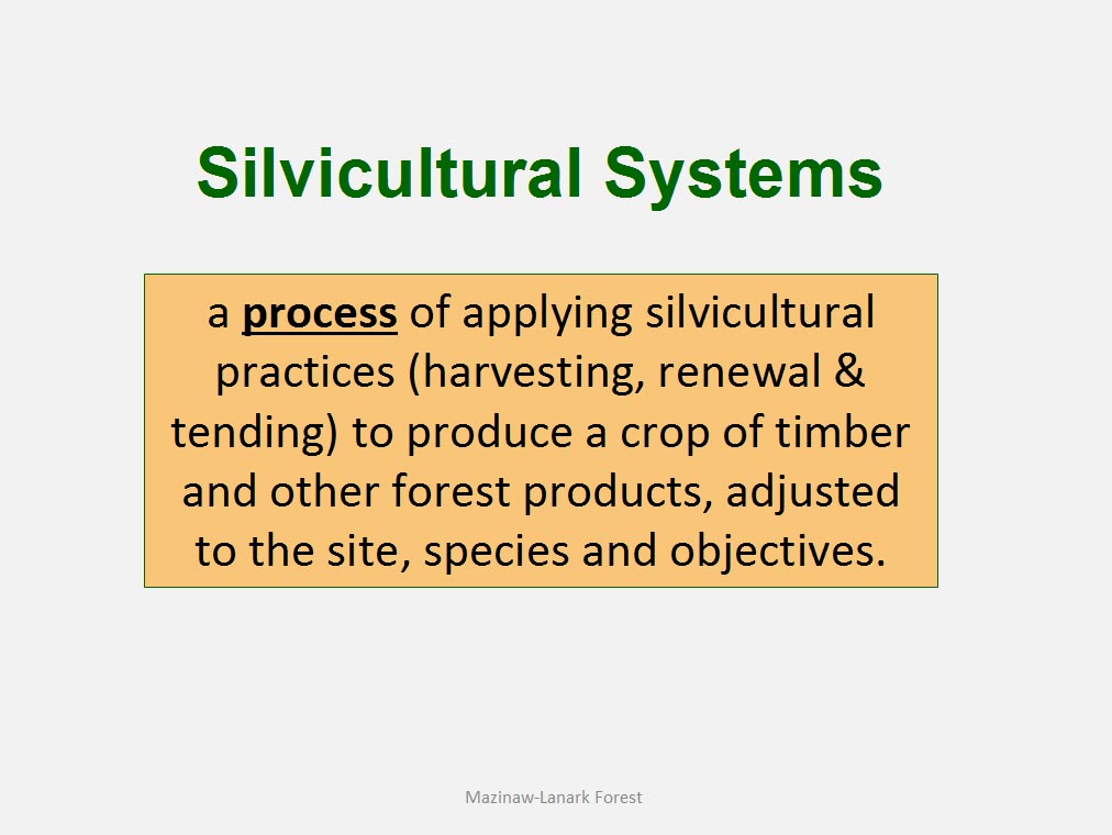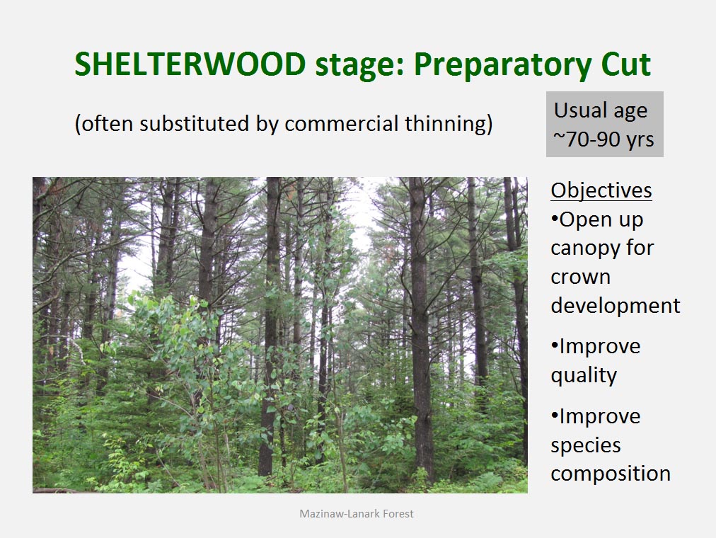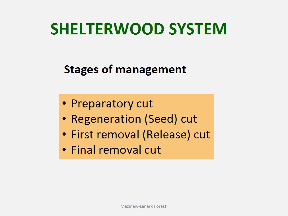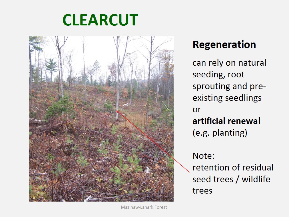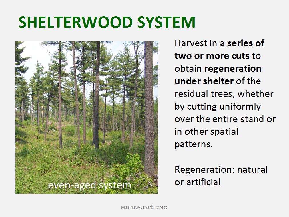 • The silvicultural objective of all harvest is to maintain healthy, vigorous forest cover but not all harvest is designed to directly trigger regeneration process. For example such treatments as commercial thinning or preparatory cut under shelterwood system are implemented to achieve improvement in spacing, average quality and stand composition rather than removal of mature trees to be replaced by young cohort.