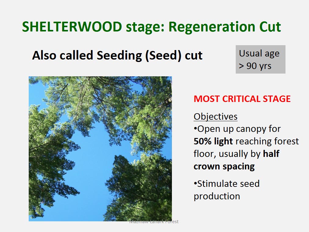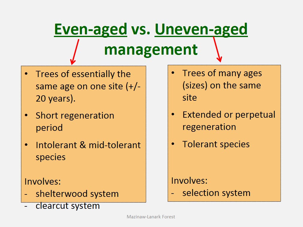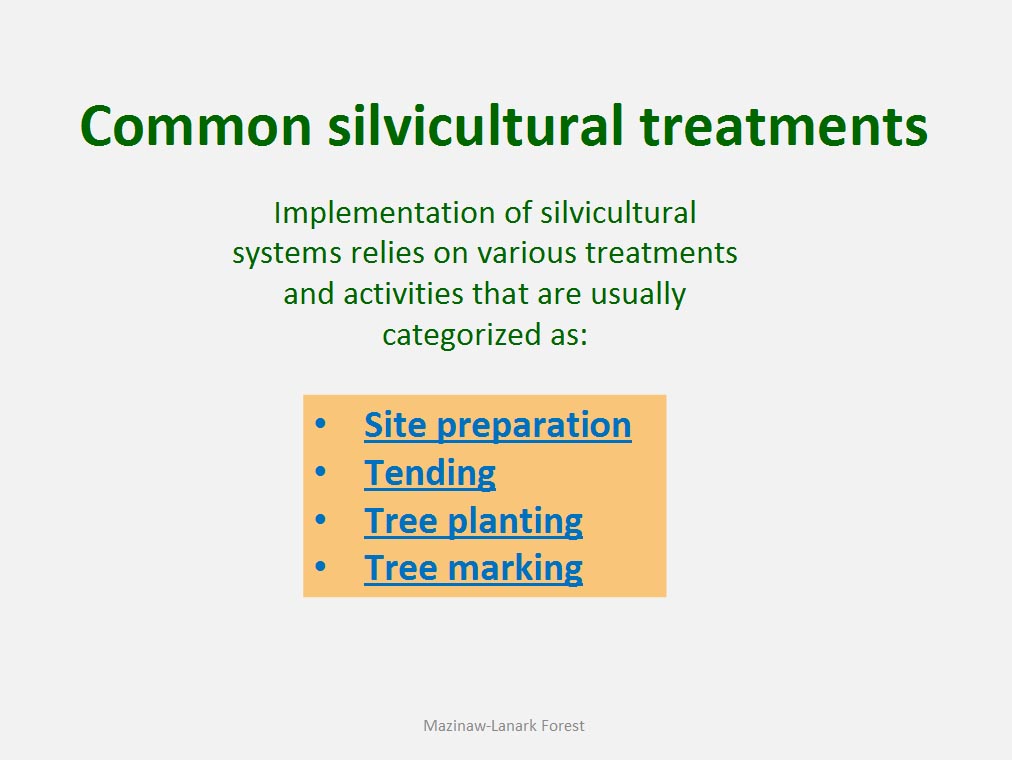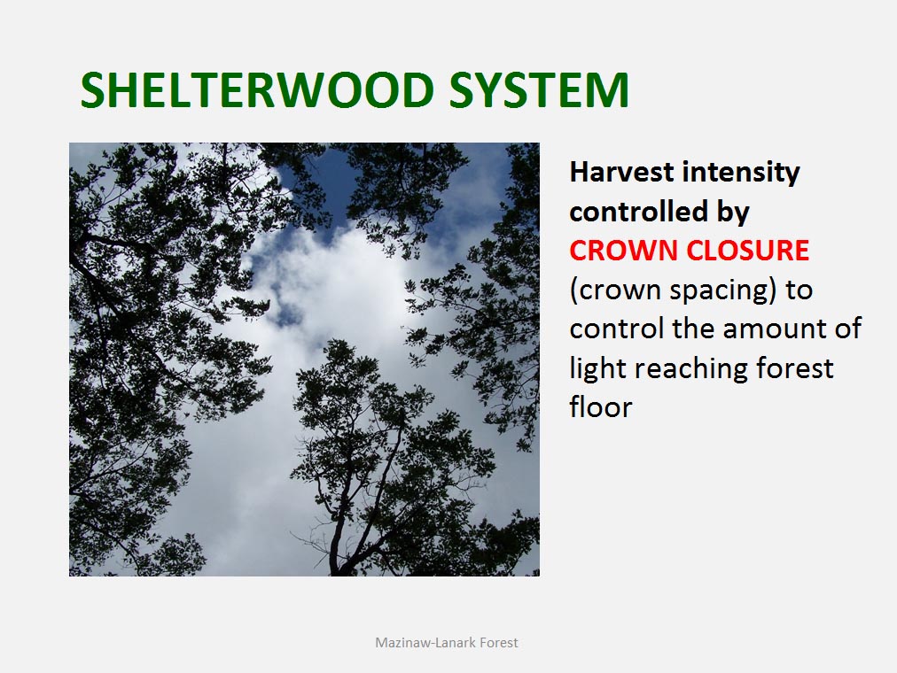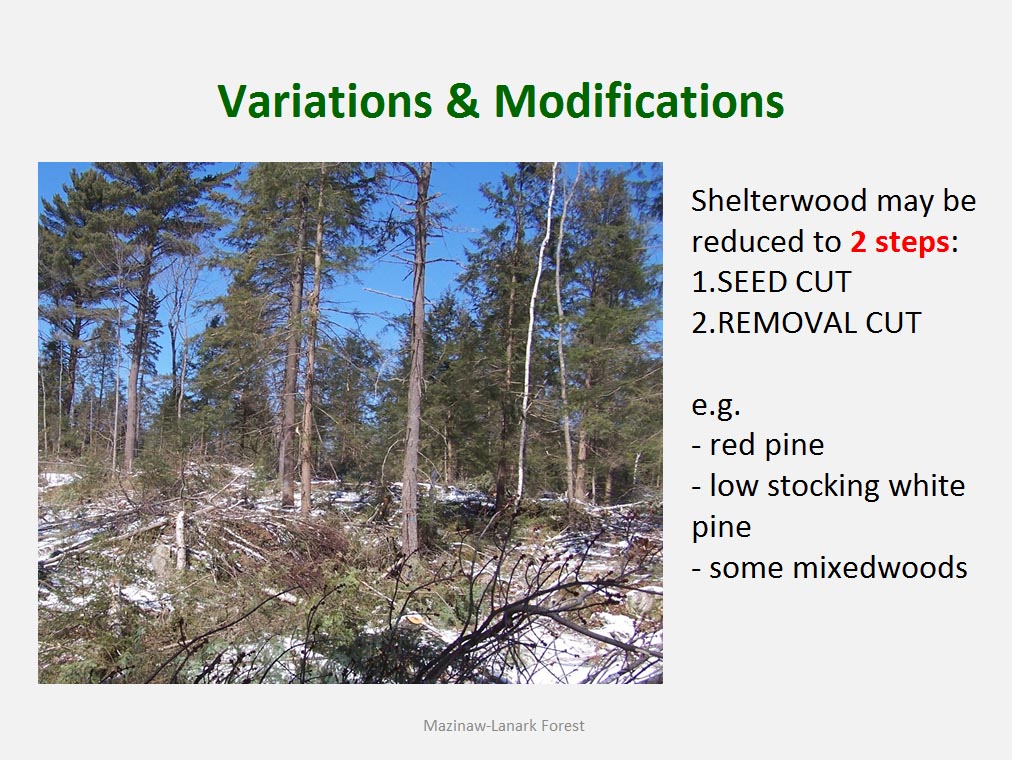 • The silvicultural objective of all harvest is to maintain healthy, vigorous forest cover but not all harvest is designed to directly trigger regeneration process. For example such treatments as commercial thinning or preparatory cut under shelterwood system are implemented to achieve improvement in spacing, average quality and stand composition rather than removal of mature trees to be replaced by young cohort.