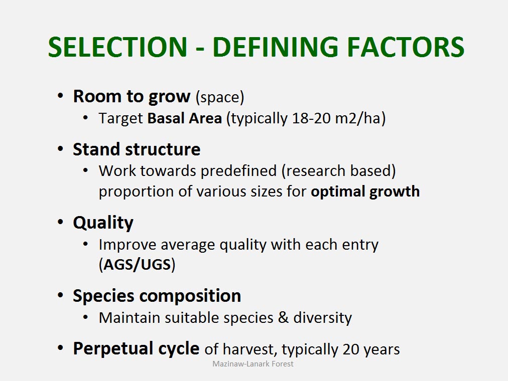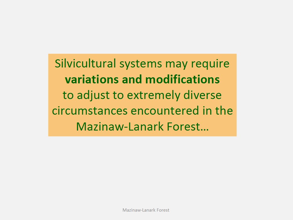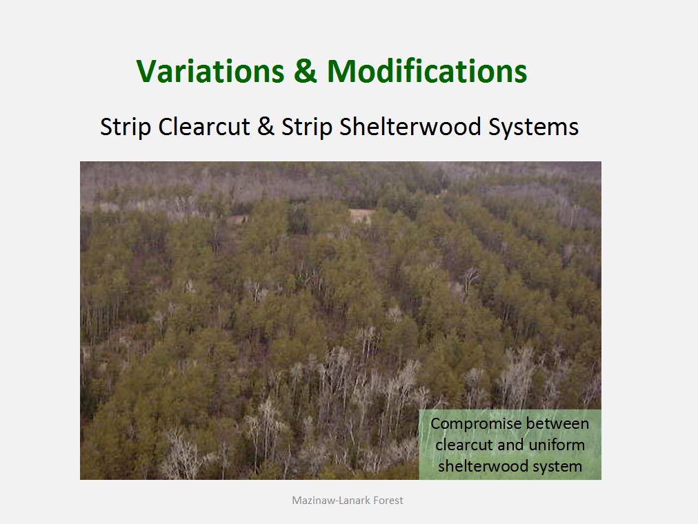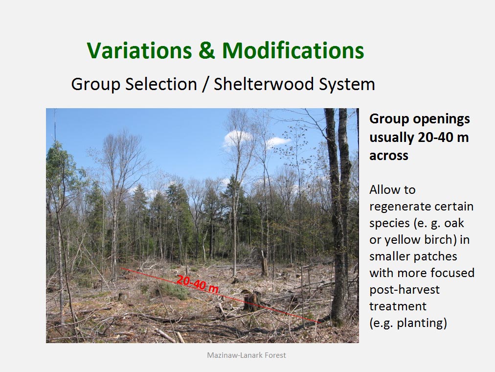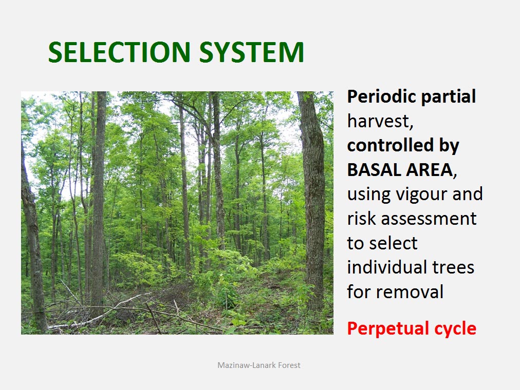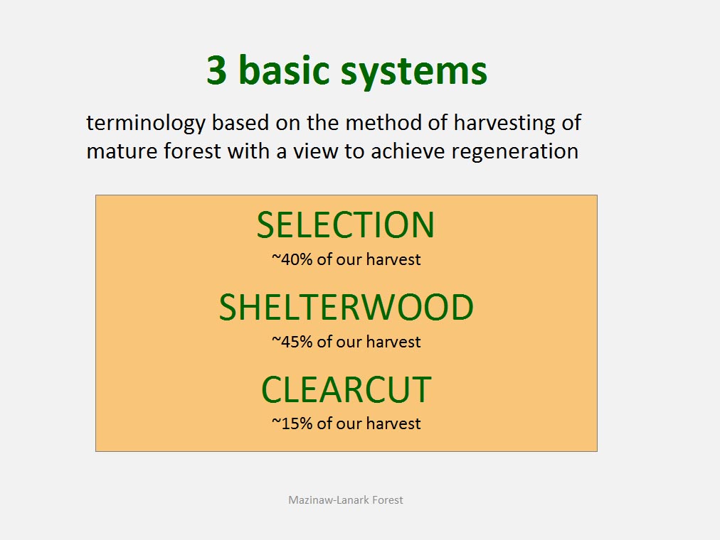 • The silvicultural objective of all harvest is to maintain healthy, vigorous forest cover but not all harvest is designed to directly trigger regeneration process. For example such treatments as commercial thinning or preparatory cut under shelterwood system are implemented to achieve improvement in spacing, average quality and stand composition rather than removal of mature trees to be replaced by young cohort.