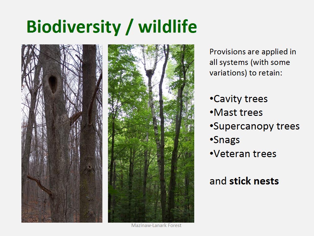 • The desire to maintain heterogeneous forest condition and the attempts to emulate natural disturbance combined with relatively low intensity of silviculture are not conducive to fully predictable and uniform management results. For example retention of various structural components for stability of habitat and continuity of natural heritage may occasionally impact the immediate needs of desired regeneration. Our overall results reflect constant balancing act between multitude of objectives and reality.
